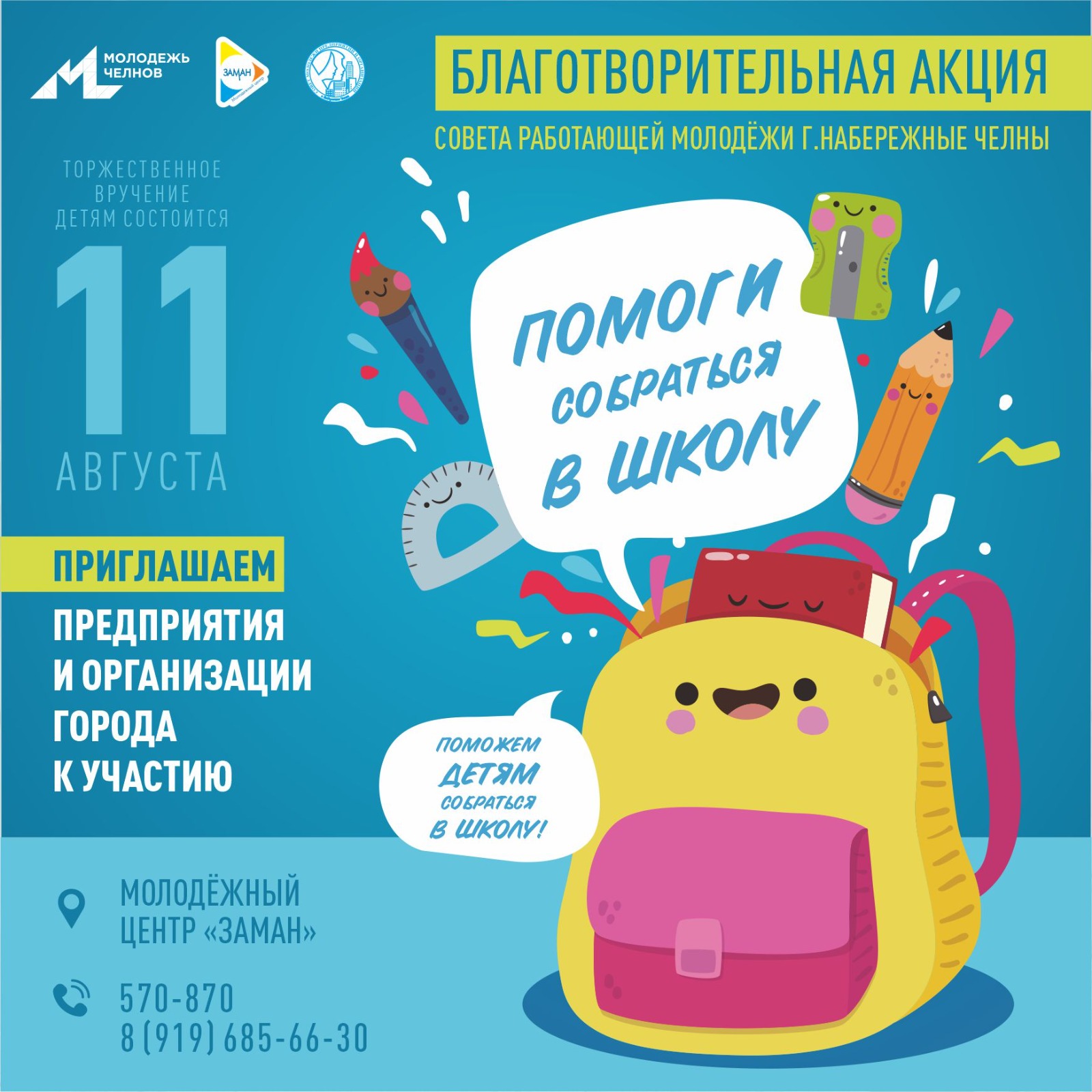 Для детей сформируют портфели с канцтоварами и прочими школьными принадлежностями. Их вручат школьникам 11 августа в МЦ «Заман» в торжественной обстановке.