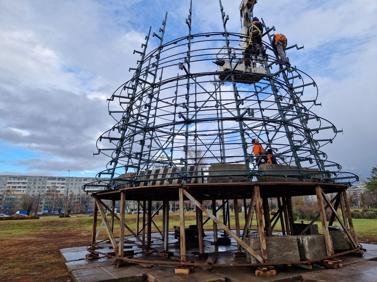 По состоянию на 2 ноября каркас новогоднего символа собран почти наполовину. Фотограф Чаллы.РФ запечатлел на площади Азатлык и другие украшения.