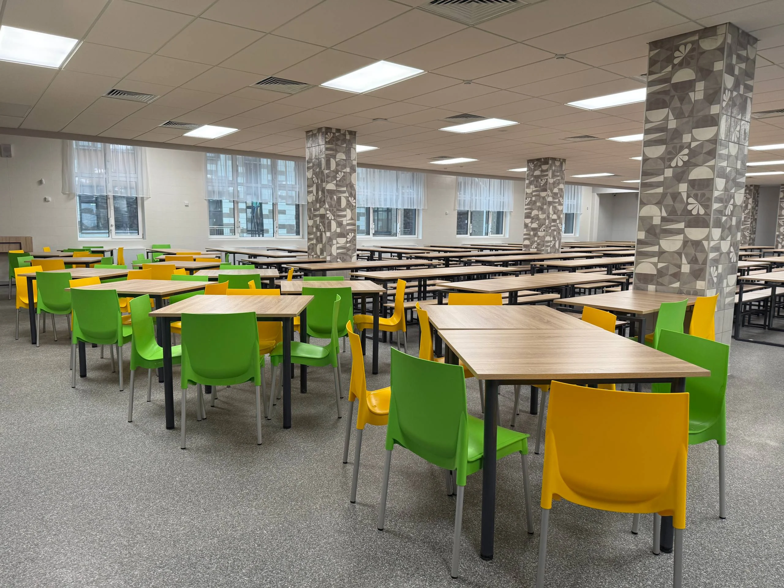 Важной частью школы стал блок, посвященный Движению Первых, что подчеркивает значимость патриотического воспитания. Столовая школы рассчитана на 600 посадочных мест, обеспечивая комфортное питание всех учащихся.