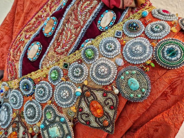 – Работы представляют собой стилизацию национального костюма рубежа веков. При создании деталей мы сохранили дух и архитектуру каждого элемента костюма, главные технологические процессы. Все формы аксессуаров и некоторые орнаменты в вышивке взяты от музейных этнографических экспонатов. Просто там, где были бы металлические ювелирные изделия, чулпы и броши со сканью, я сделал вышитые бисером и камнями детали.