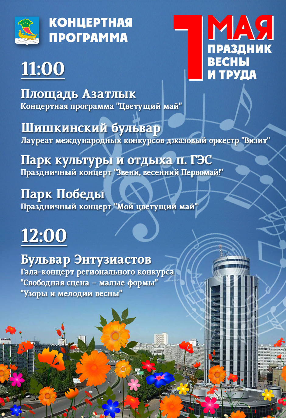 11.00 Площадь «Азатлык». Праздничная программа «Цветущий май», посвященная Празднику Весны и Труда.