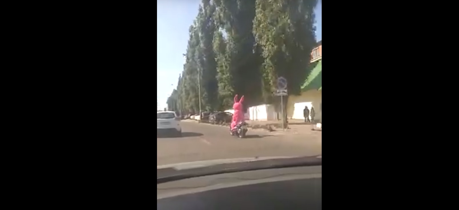 Розовый кролик едет на байке без шлема. В пресс-службе Госавтоинспекции по Воронежской области рассказали, что такое нарушение влечёт за собой штраф в 1000 рублей. А ещё в ведомстве обещали обратить внимание патрульных служб на эпатажного мотоциклиста.
