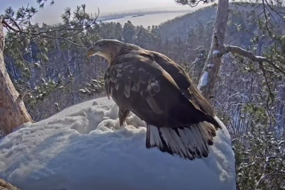 На кадрах видно, как у гнезда приземляются две птицы. Молодой орлан опасается незнакомого предмета (камеры), поэтому несколько раз срывается с места, но снова возвращается. В какой-то момент самец пытается пристроится на ветке рядом с Камой, но пернатой даме такая идея пришлась не по душе и она прогоняет назойливого ухажера.
