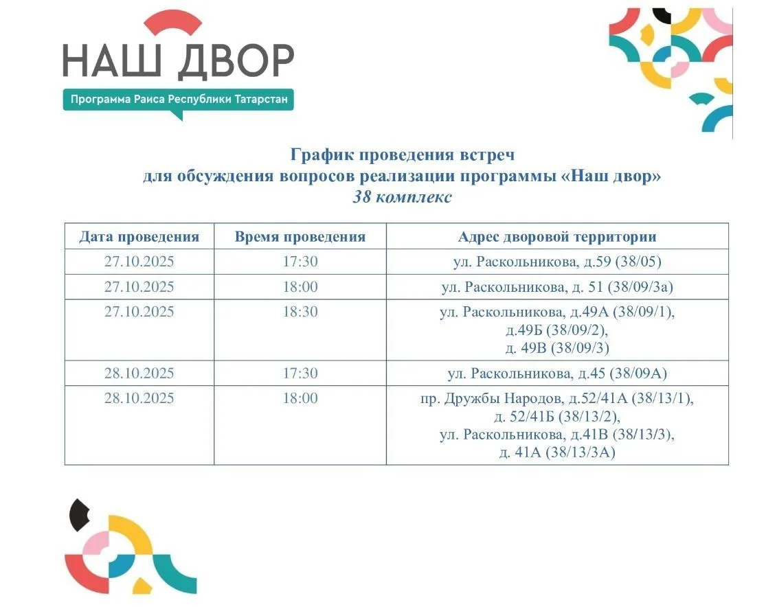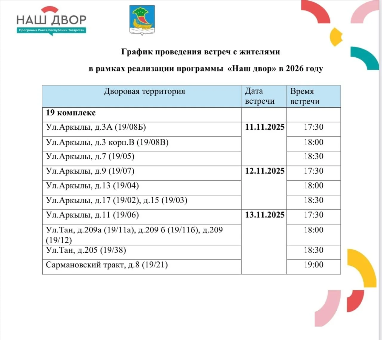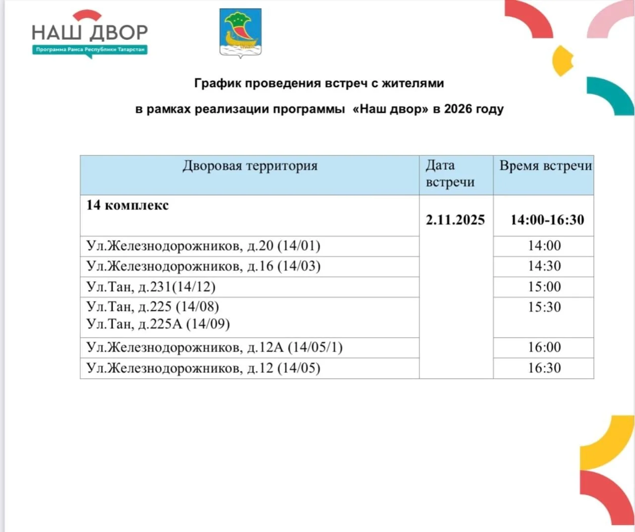 В конце октября в Набережных Челнах начнутся встречи с жителями по программе «Наш двор». Жители смогут принять участие в планировании обновления своих территорий. Приглашаются владельцы квартир в домах, включённых в план работ на 2026 год. «Челнинские известия» поделились графиком встреч.