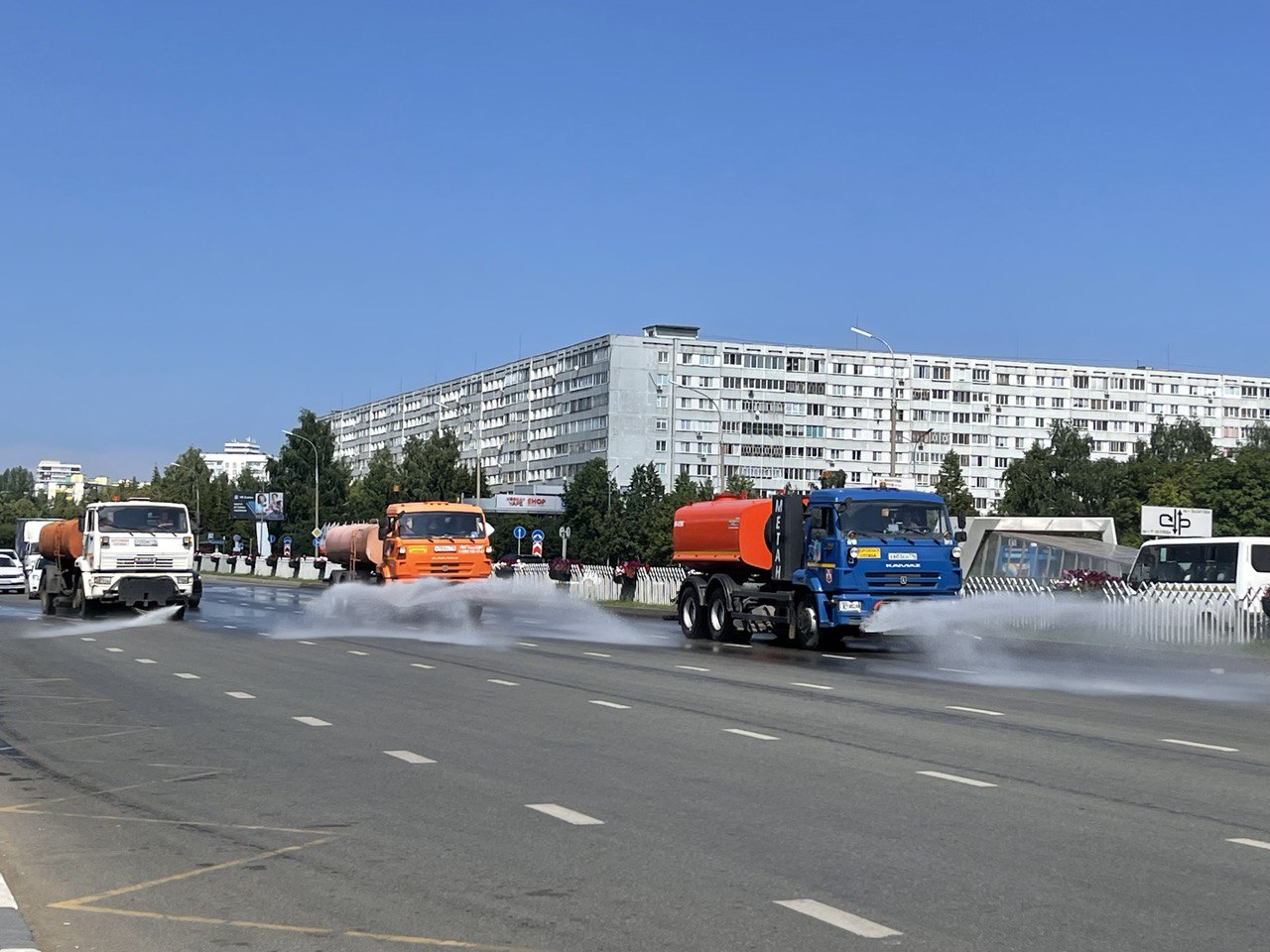 В жаркую погоду в Набережных Челнах с 7 утра до 16 часов ведется регулярный полив дорог. При +25 градусах полив асфальтового покрытия организован ежедневно. Сегодня на линии девять поливомоечных машин. Каждый автомобиль в день делает от 6 до 8 рейсов.