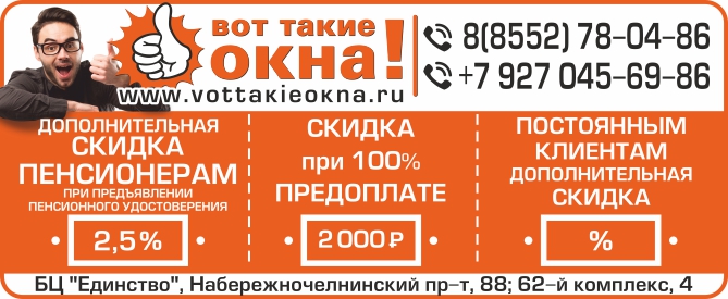 Наступили холода, а значит, самое время обратить внимание на состояние ваших окон. Компания «Вот такие окна!» предоставляет качественное сервисное обслуживание ПВХ-конструкций. Наши специалисты могут не только быстро сменить уплотнитель и стеклопакет, но еще и отремонтировать, заменить и смазать фурнитуру. Ежемесячно действуют различные Акции и Скидки, которые и делают сотрудничество с нашей компанией выгодной! Мы всегда ценим своих клиентов, поэтому большинство челнинцев обращаются к нам повторно.