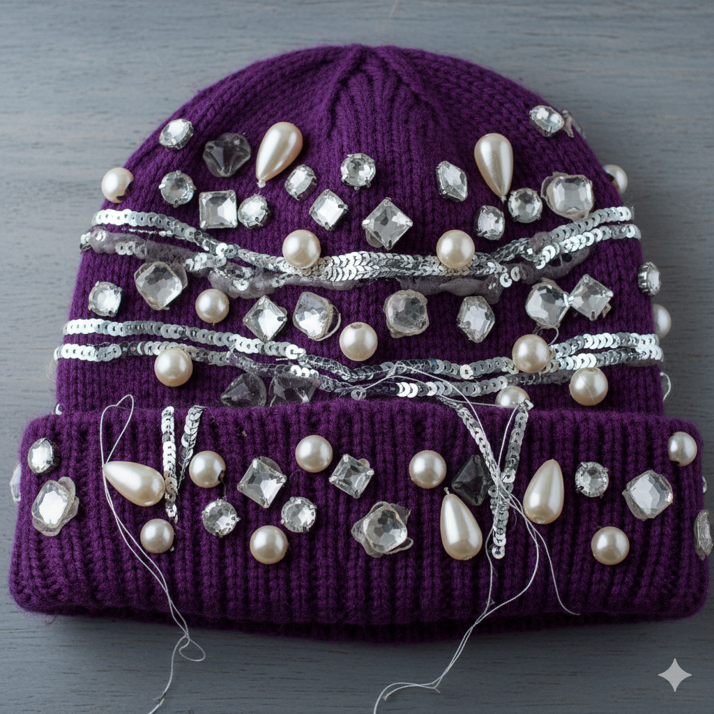Классические «зимние» мотивы вроде снежинок, оленей или кос — не просто ретро-ностальгия. Они создают визуальный шум: узор перебивает линию лица, отвлекает от глаз, размывает силуэт. То же касается и декора: громоздкие помпоны, стразы по периметру, крупные аппликации — всё это относится к эпохе, когда акцент делался на праздничности, а не на индивидуальности.