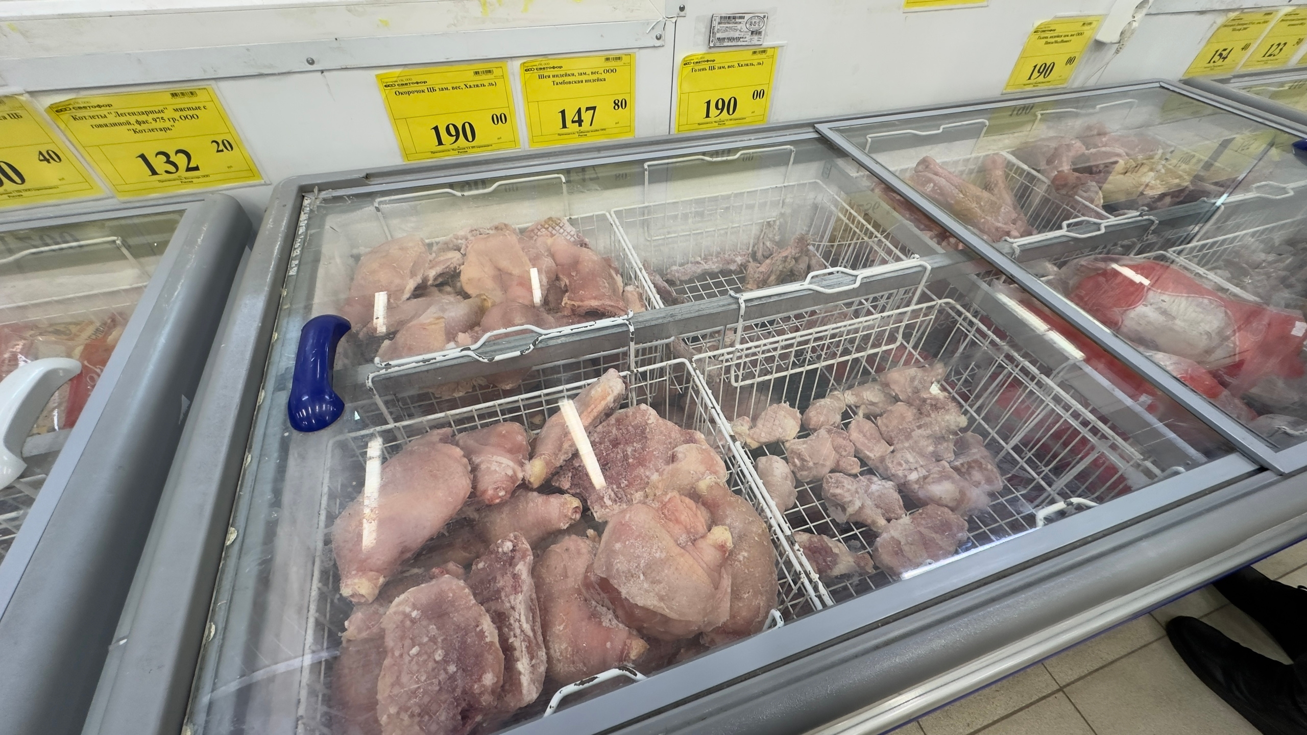 На это хозяйка между делом сказала, что видела индейку по очень низкой цене в Светофор. Замороженные стейки из голени продавались примерно по 190 рублей за килограмм. Казалось бы, находка.