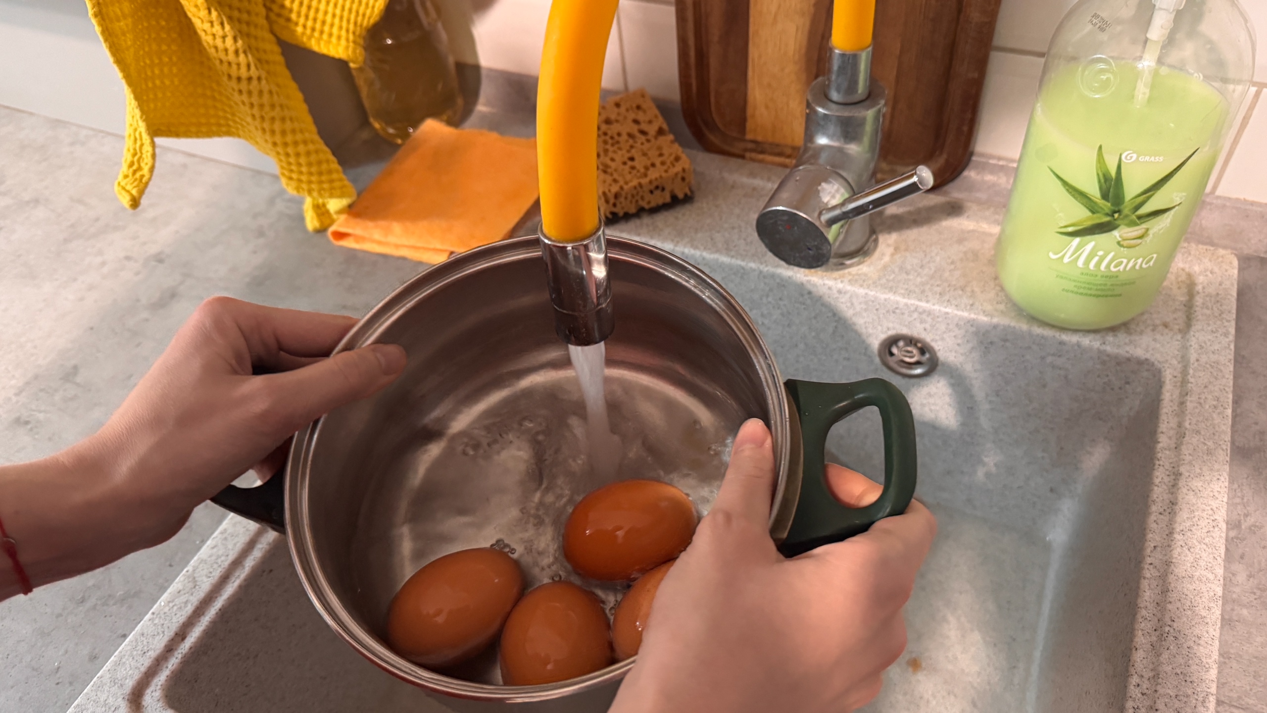 - Положите яйца в кастрюлю и залейте холодной водой.