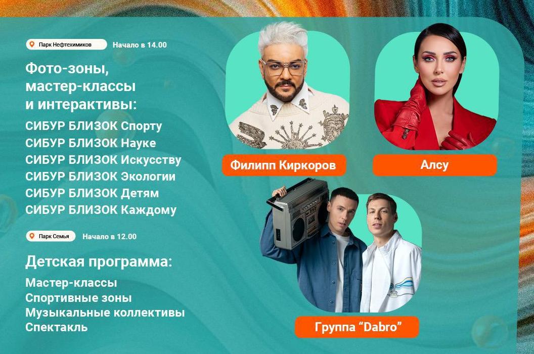 В праздничный день будут работать несколько площадок: детская программа запланирована в парке «Семья» (старт в 12:00), хедлайнеры мероприятия выступят в парке Нефтехимиков (старт в 14:00).