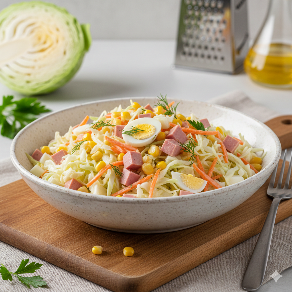 Основа салата — свежая белокочанная капуста. Её тонко шинкуют, слегка солят и аккуратно обминают руками, чтобы она пустила сок и стала мягче, но сохранила характерный хруст. К ней добавляется сочная морковь, натёртая на крупной тёрке, — она вносит яркость и лёгкую сладость. Консервированная кукуруза придаёт блюду солнечную нотку и приятную зернистую текстуру, а варёно-копчёная колбаса — насыщенный, чуть дымный аромат и плотность.