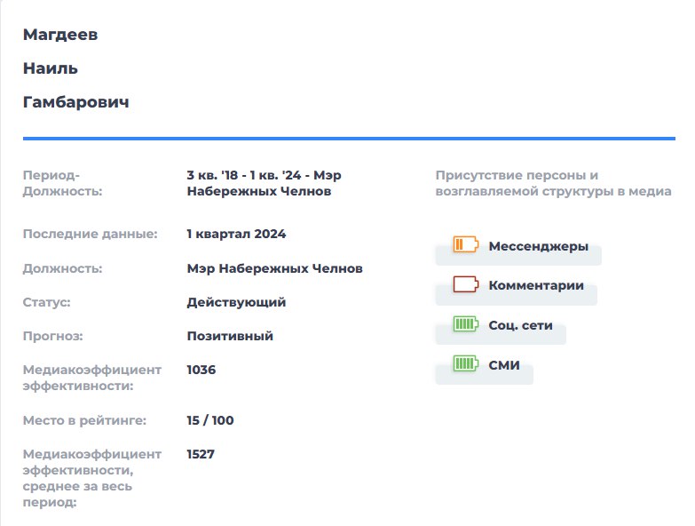 Согласно рейтингу, мэр автограда получил медиакоэффициент эффективности 1036. Наиль Магдеев особо отметился присутствием в СМИ и соцсетях, но при этом показал низкий уровень в части ответов на комментарии. По сравнению с прошлым отчетным периодом его позиция снизилась на 4 пункта. Лидирует в рейтинге прокурор РТ Альберт Суяргулов, на втором месте мэр Казани Ильсур Метшин, на третьем - министр спорта РТ Владимир Леонов.