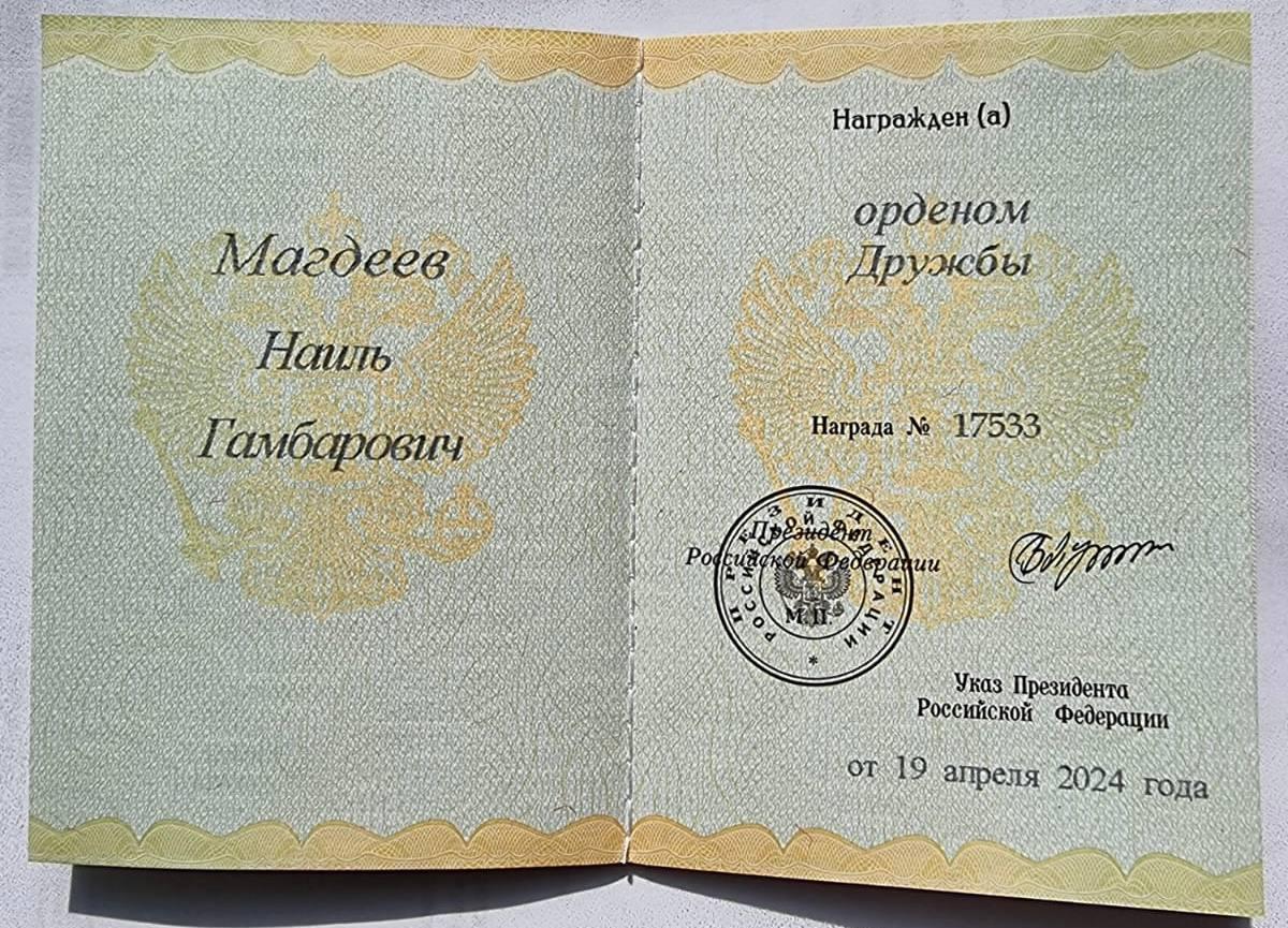 Указ о награждении Наиля Магдеева за заслуги в развитии местного самоуправления и многолетнюю добросовестную работу был подписан президентом РФ Владимиром Путиным 19 апреля 2024 года.
