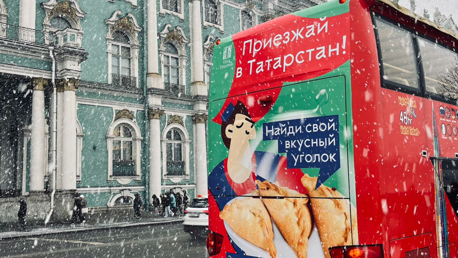 На баннерах изображены символы республики, эчпочмаки и надпись «Приезжай в Татарстан! Найди свой вкусный уголок». По Москве курсирует шесть автобусов с таким призывом, по Питеру – восемь.