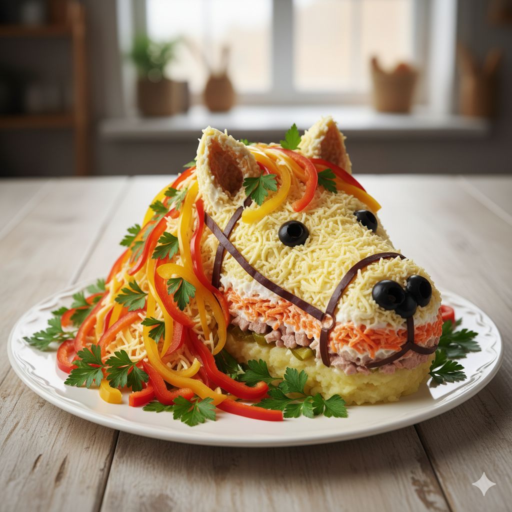 Основа — проста и проверена: отварное мясо, картофель, морковь, яйца, солёные огурцы, твёрдый сыр. Никакой экзотики, лишь честные, домашние продукты. Но магия — в подаче. Вместо привычного салатника, слои укладываются на большое плоское блюдо, следуя очертаниям силуэта лошадиной головы: широкий лоб, изящная мордочка, плавный изгиб шеи.