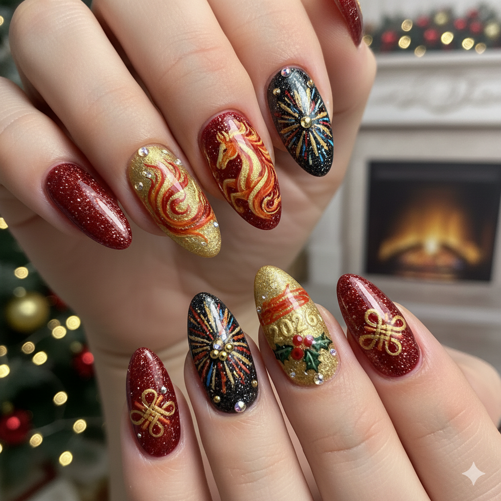 Новый 2026 год, по восточному календарю, пройдёт под покровительством Красной Огненной Лошади — символа энергии, страсти, импульса и яркой индивидуальности. Эта стихия не терпит полумер: ей чужды тусклые оттенки, сдержанные жесты и скромные решения. Если вы хотите не просто встретить праздник, но и заручиться расположением столь мощного талисмана, ваш маникюр должен быть как миниатюрный фейерверк — смелым, запоминающимся, наполненным движением и светом.