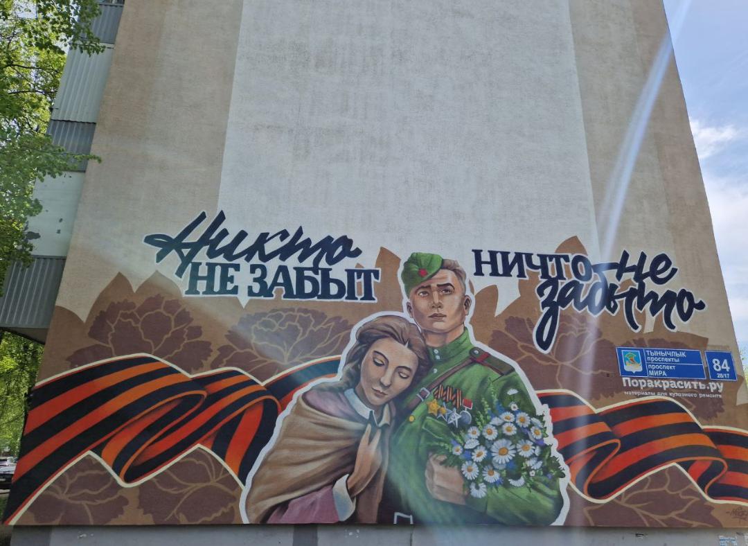 Мурал на торце дома 28/17 появился на прошлой неделе. Над его созданием трудился известный мастер граффити Марат Билялов.Ранее он завершил масштабный рисунок на стене на ул. Сергея Титова. Изображения также посвящено грядущему Дню Победы.