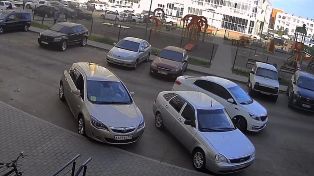 На записи видно, как водитель KIA Rio медленно едет по двору, вероятно выбирая место для парковки, затем иномарка плавно поворачивает в сторону тротуара, но внезапно резко ускоряется и перескочив через бордюр, на скорости врезается в балкон первого этажа.