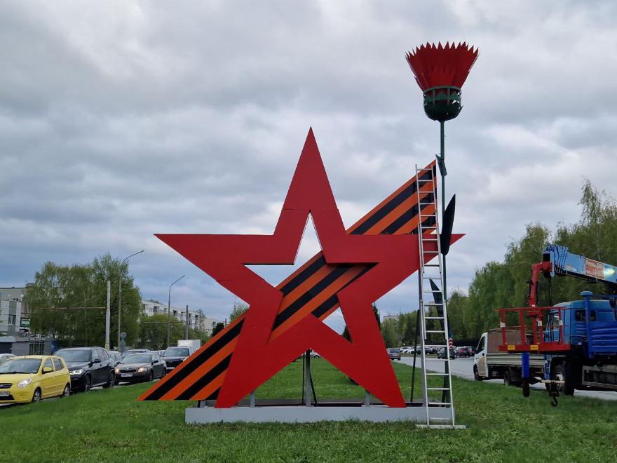Набережные Челны продолжают украшать к грядущему празднованию 80-летия Победы в Великой Отечественной войне. Так, накануне на пересечении проспектов Раиса Беляева и Мира установили конструкцию в виде пятиконечной звезды. Композицию дополняет георгиевская лента и красная гвоздика.