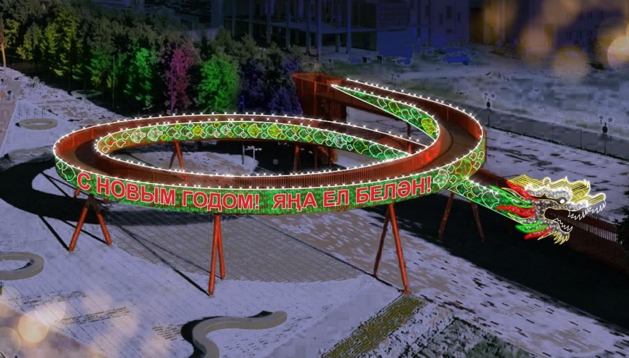 Оранжевая смотровая площадка на время сменит цвет - ее украсят зеленой иллюминацией с узором под чешую змеи, а на тело нанесут надписи «С Новым годом! Яңа ел белән!». Вторая змея будет выполнена в форме коридора из арок бело-золотого цвета.