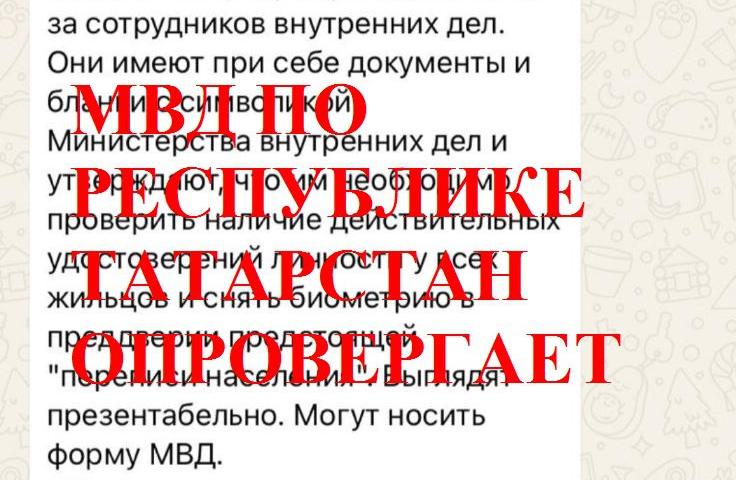 В пересылаемом тексте говорится о том, МВД предупреждает о группе людей, выдающих себя за правоохранителей. Неизвестные под видом сотрудников ведомства проверяют паспорта жильцов и просят их сдать отпечатки пальцев. Все это якобы необходимо для предстоящей переписи населения. Сообщается, что у мошенников при себе есть ноутбук и средство для снятия биометрии.