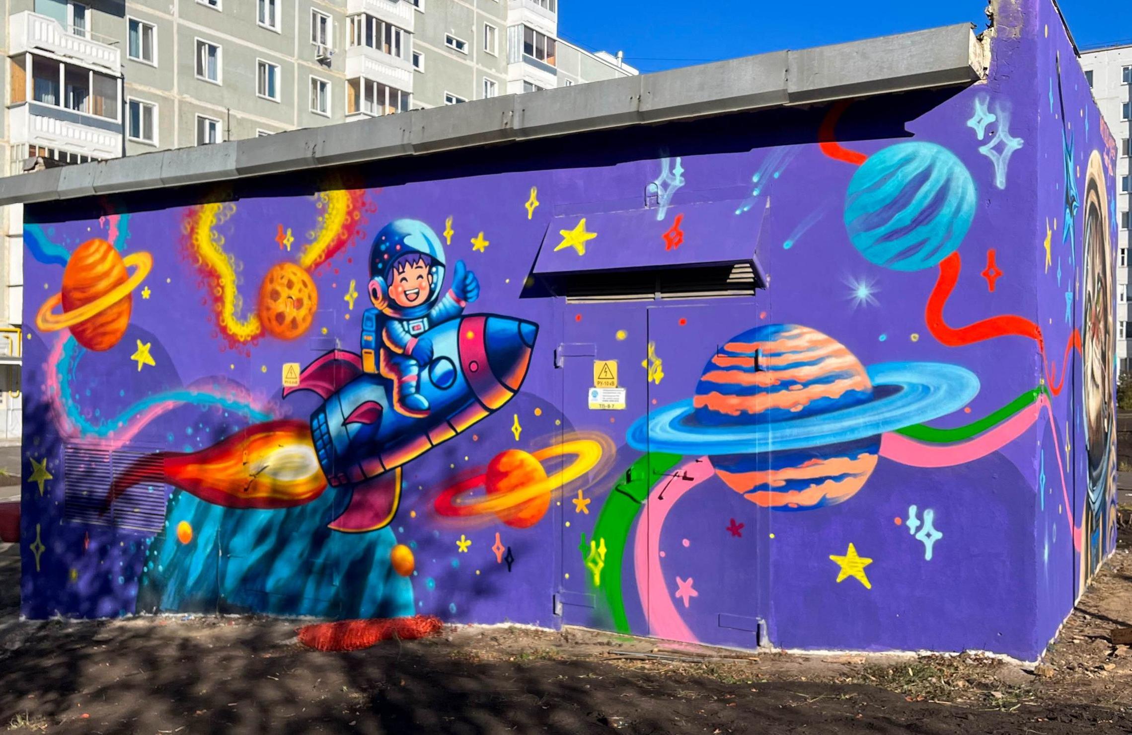 Художник приступил к работе на прошлой неделе, а сегодня администрация Челнов опубликовала фотографии результата. Так, на одной из стен изображен мультяшный космонавт, летящий на ракете, на другой – портрет кота в скафандре. Выбор космической темы объясняется близостью детского сада «Звездочка».