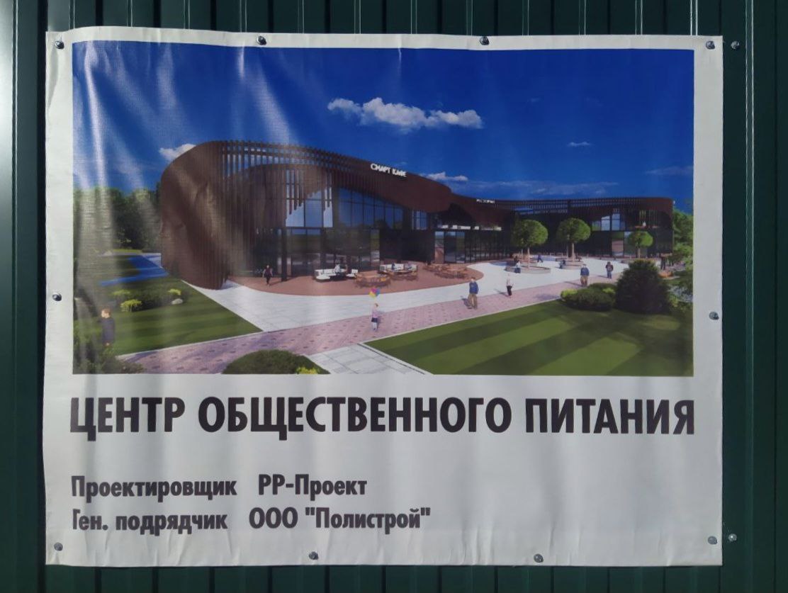 На информационном стенде изображен макет будущего центра, указано, что проектировщиком выступает ООО «РР-Проект», а генеральным подрядчиком – ООО «Политстрой». Перечень работ, контакты заказчика и подрядчика, продолжительность строительства и прочая обязательная информация на размещенном аншлаге отсутствуют.